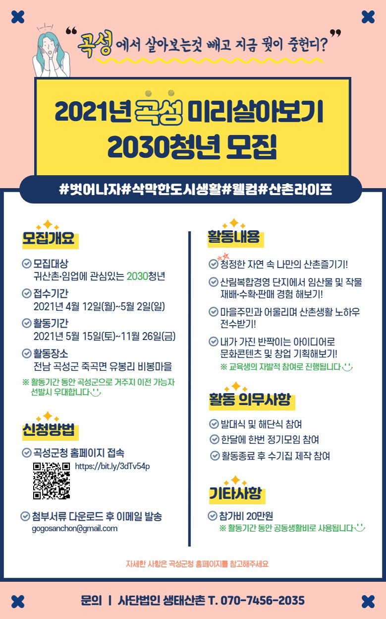 - 접수방법 : 곡성군 홈페이지 열람→ 첨부자료 다운 →이메일 발송(gogosanchon@gmail.com) - 문의사항 : (사)생태산촌 02-7456-2035 ※(사)생태산촌은 산촌지역 활성화를 위해 활동하는 NGO단체입니다.