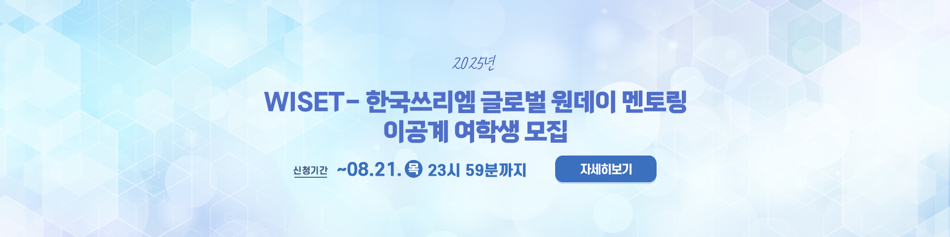 ▶ W브릿지 > 네트워크 > 글로벌 멘토링 > 멘토링 목록 내 「2025년 WISET-한국 쓰리엠 글로벌 멘토링」 신청