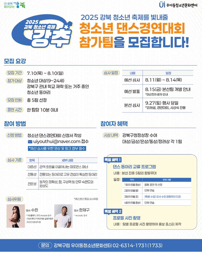 * 신청방법: 우이동청소년문화센터 ⇒ 커뮤니티 ⇒ 공지사항 ⇒ 2025 강북청소년축제 ‘강추’ 참가자 모집