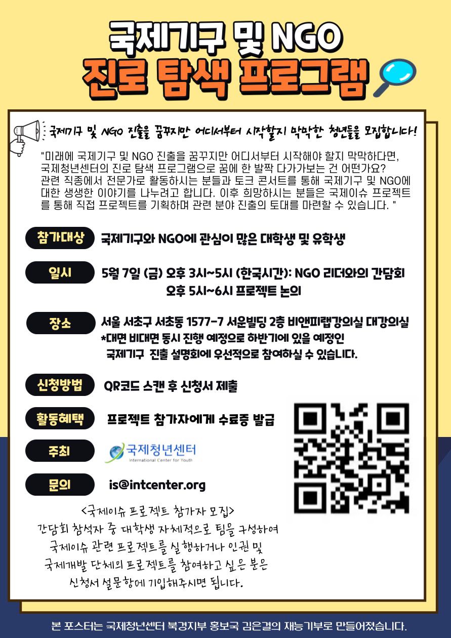 미래에 국제기구 및 NGO 진출을 꿈꾸지만 어디서부터 시작해야 할지 막막하다면, 국제청년센터의 진로 탐색 프로그램으로 꿈에 한 발짝 다가가 보는 건 어떤가요? 관련 직종에서 전문가로 활동하시는 분들과 토크 콘서트를 통해 국제기구 및 NGO에 대한 생생한 이야기를 나누려고 합니다. 이후 희망하시는 분들은 국제이슈 프로젝트를 통해 직접 프로젝트를 기획하며 관련 분야 진출의 토대를 마련할 수 있습니다.