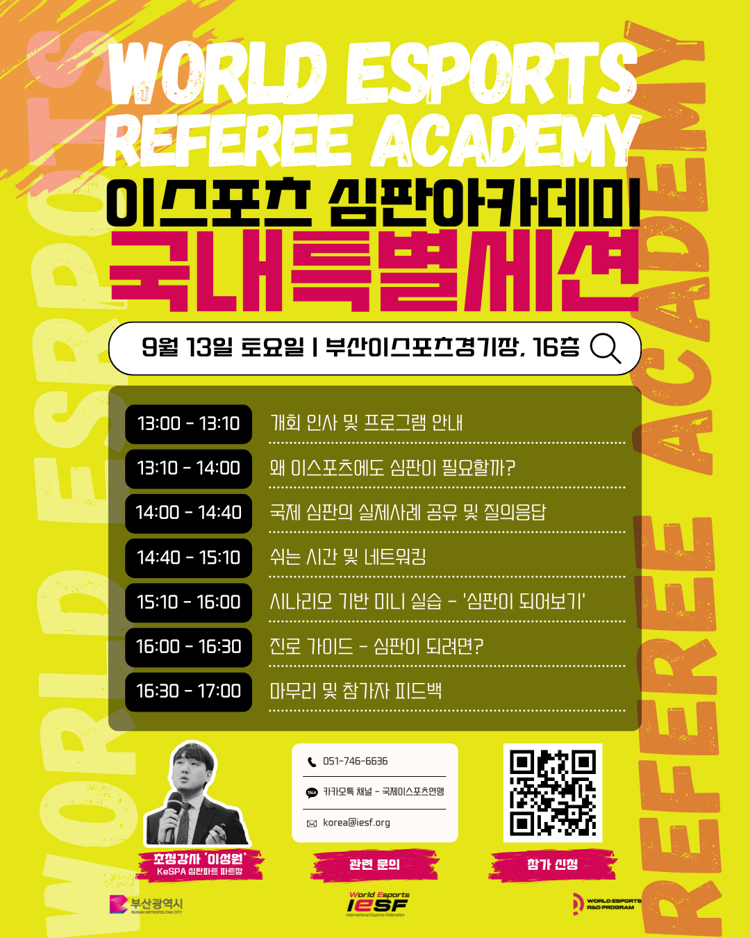 ※ 본 프로그램은 부산광역시의 지원으로 운영되는 「국제이스포츠연맹 R&D 센터 운영」 민간위탁 사업 중 ‘국제이스포츠심판아카데미’의 일환으로, 국내 특별 세션으로 기획된 시민 대상 진로 교육 프로그램입니다.