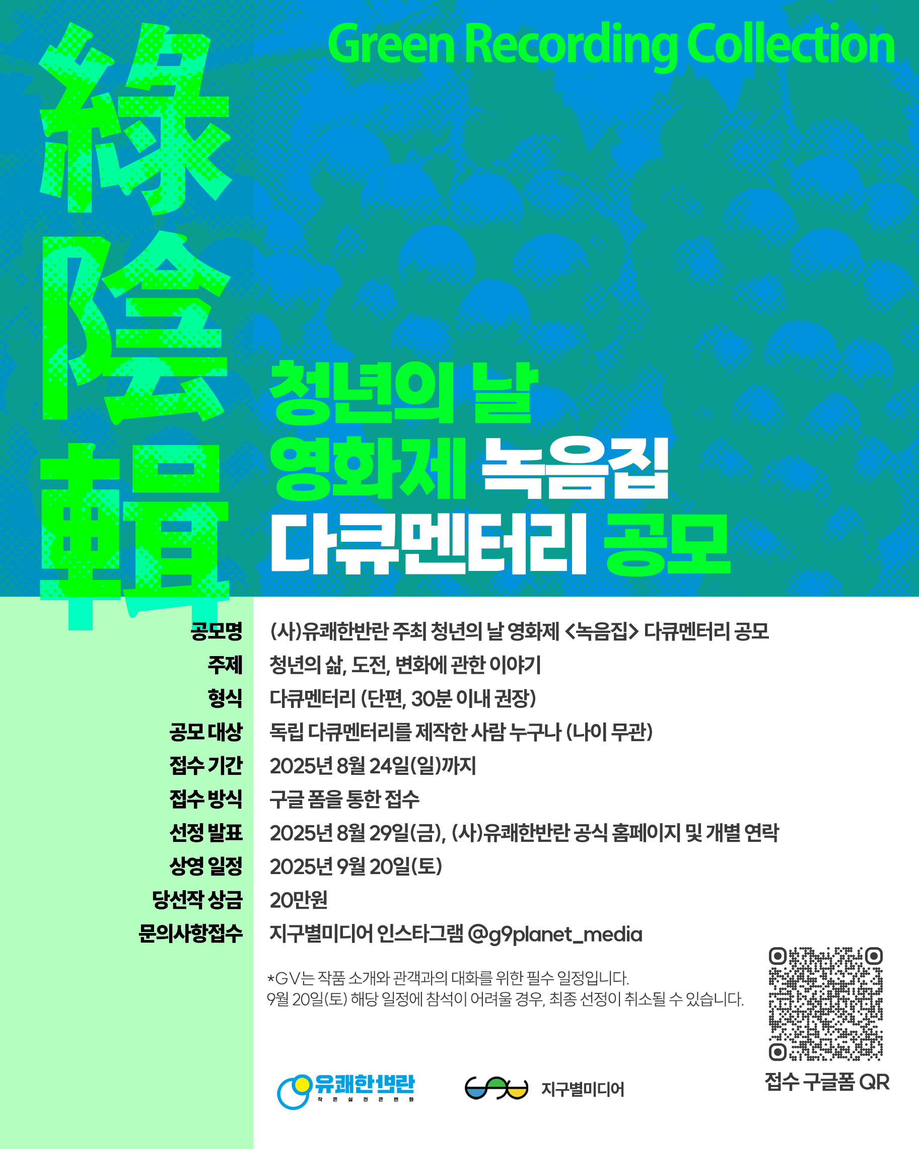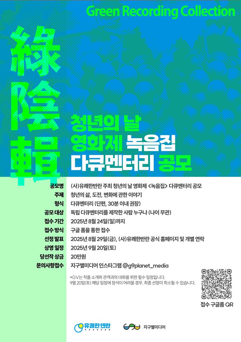 청년의 삶, 도전, 변화에 대한 다큐멘터리라면 어떤 이야기든 좋아요. 빛나고, 무너지고, 흔들리던 순간까지.푸르지만은 않았던 청춘의 기록이 녹음집의 한 장면이 될 수 있어요!
