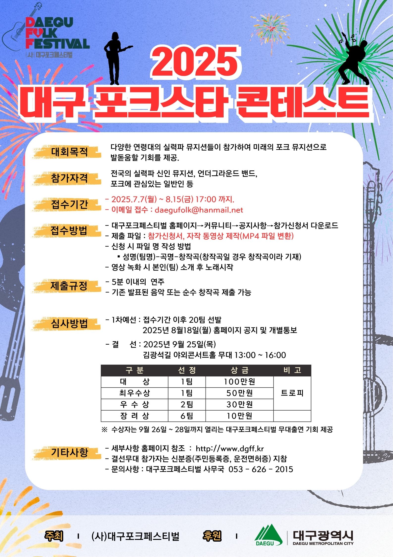 ● 접수 방법: daegufolk@hanmail.net 으로 참가 신청서와 5분 이내의 커버곡 또는 창작곡 동영상 제출