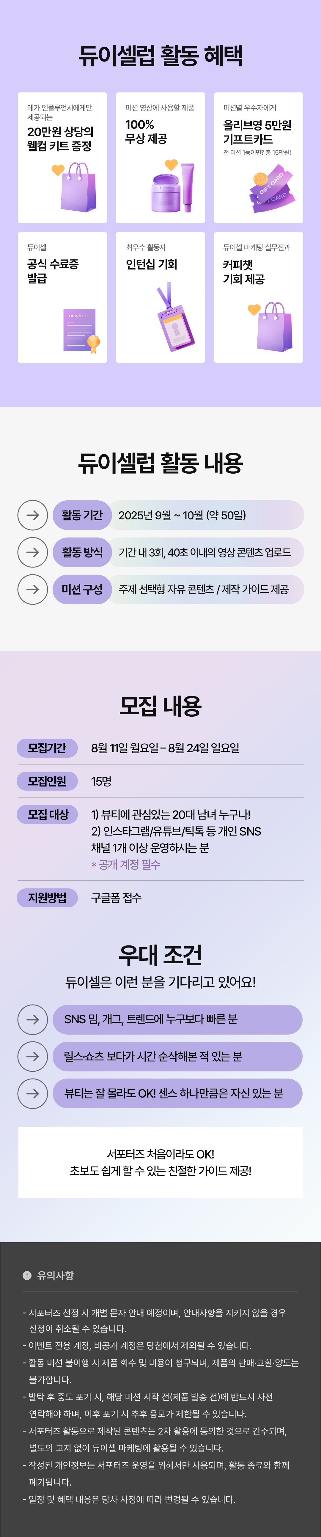 - 서포터즈 활동으로 제작된 콘텐츠는 2차 활용에 동의한 것으로 간주되며, 별도의 고지 없이 듀이셀 마케팅에 활용될 수 있습니다.