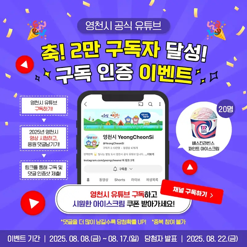 영천시 유튜브 채널이 구독자 2만 명을 달성했습니다! 👏👏