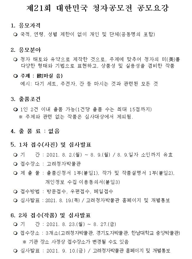 - 심사발표 : 2021. 9. 10.(금) / 고려청자박물관 홈페이지 및 개별통보