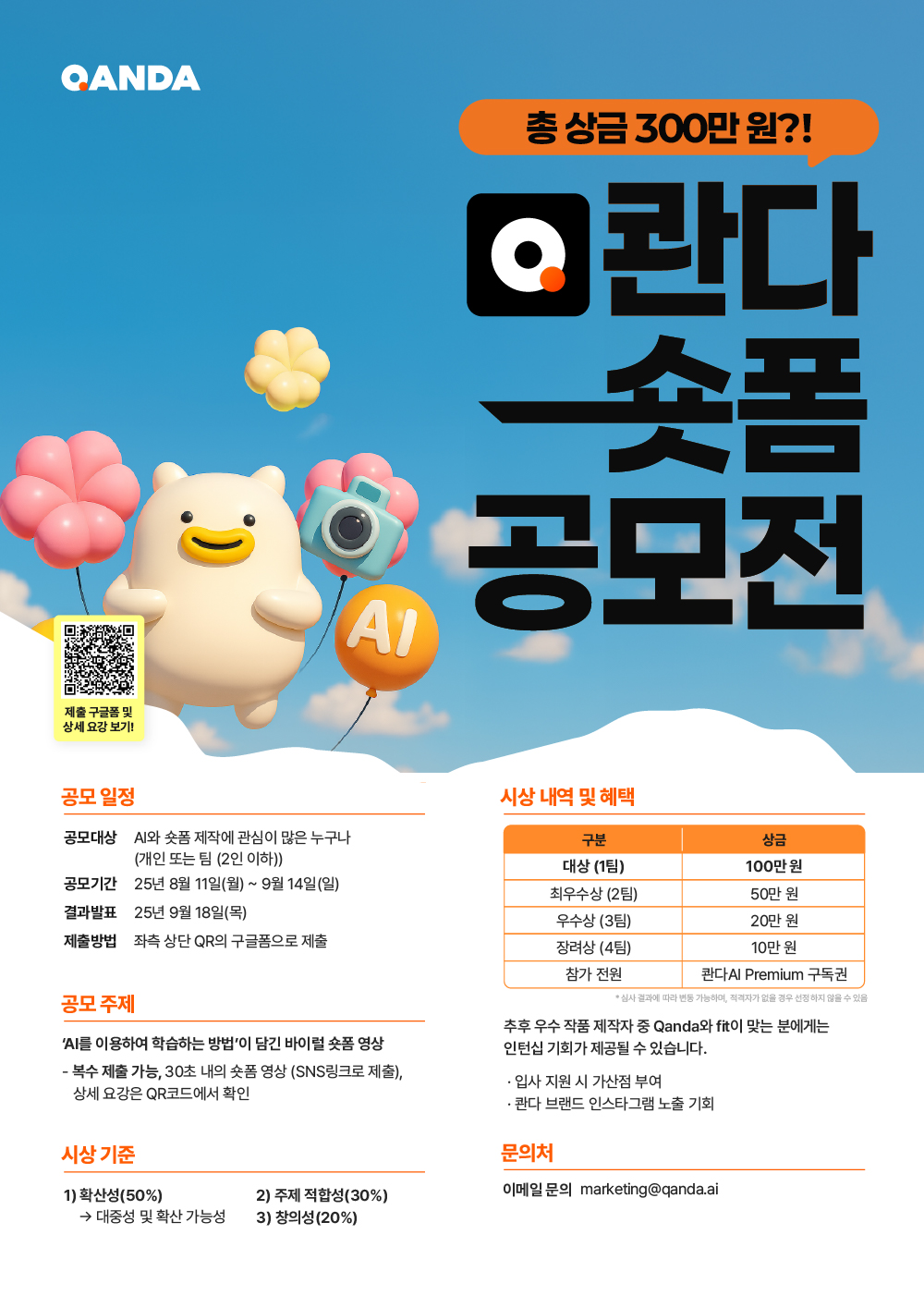 짧고 임팩트 있는 영상으로 사람들의 시선을 사로잡을 수 있는 분이라면 최고의 기회입니다. 추후 우수 작품 제작자 중 Qanda와 fit이 맞는 분에게는 인턴십 기회가 제공될 수 있습니다.