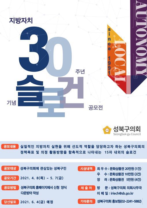 성북구의회에서는 지방자치법 전부개정 및 지방자치 30주년을 맞아 진정한 지방자치 실현을 위해 성북구의회의 역할 및 선도적 의정활동을 표현하는슬로건을 선정하고자 합니다.「성북구의회 슬로건 공모」에 평소 성북구의회와 의정활동에관심 있는 분들의 많은 참여 바랍니다.