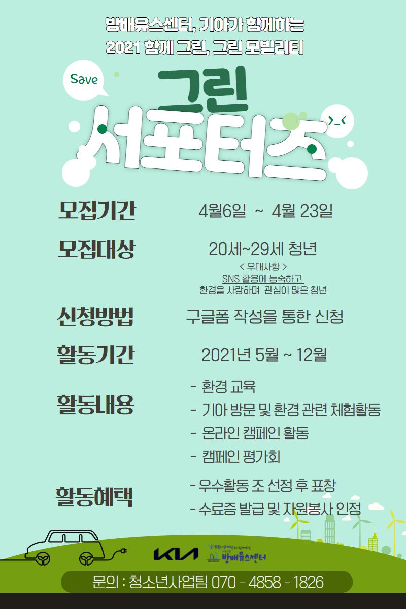 2021년 기아&방배유스센터와 함께 환경을 함께 지켜나갈, 그린서포터즈를 모집합니다!