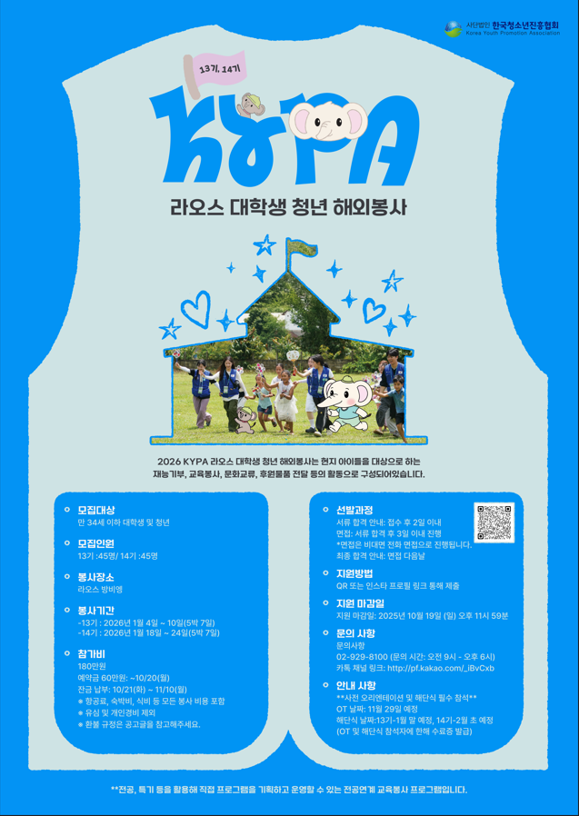 라오스에서의 특별한 7일, 잊지 못할 경험이 될 KYPA (한국청소년진흥협회) 해외봉사단 13·14기 참가자를 모집합니다! 🙌🏻💙