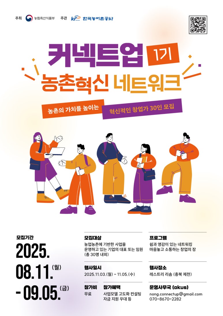 농림축산식품부와 한국농어촌공사에서는 농업․농촌에 기반한 다양한 분야의 창업가들간의 네트워크를 형성하고, 농촌의 발전을 위한 새로운 아이디어를 발굴하기 위해 「2025 커넥트업 농촌혁신 네트워크」를 추진하고자 합니다. 농업·농촌의 새로운 기회를 발견하고 변화를 이끌어가기 위해 다양한 분야의 혁신적인 창업가들의 관심과 참여를 부탁드립니다.