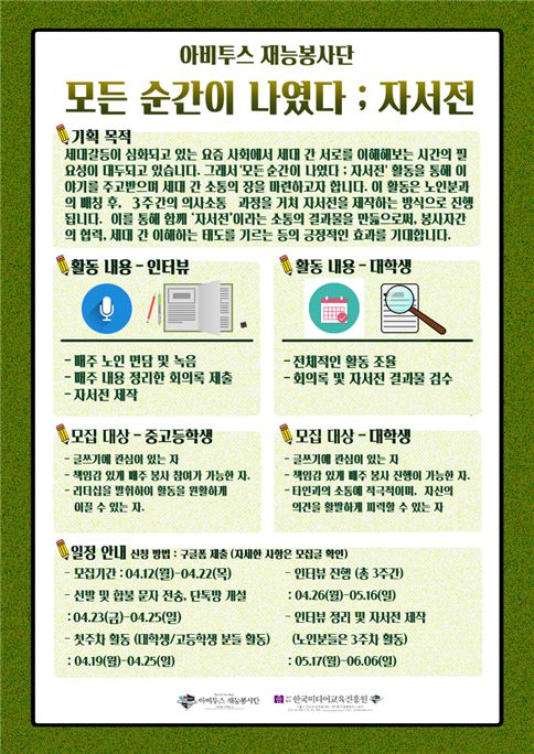 노인분들 자서전 제작에 도움을 주실 중고등학생, 대학생 봉사자를 모집합니다.