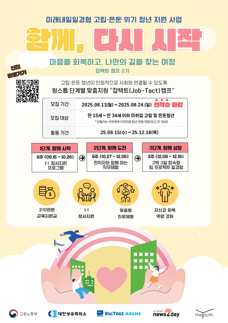 - 모집대상: 만 15세 ~ 만 34세 미취업 고립 위기 청년 (※ 군필자의 경우 복무기간 만큼 제한 연령 연장)