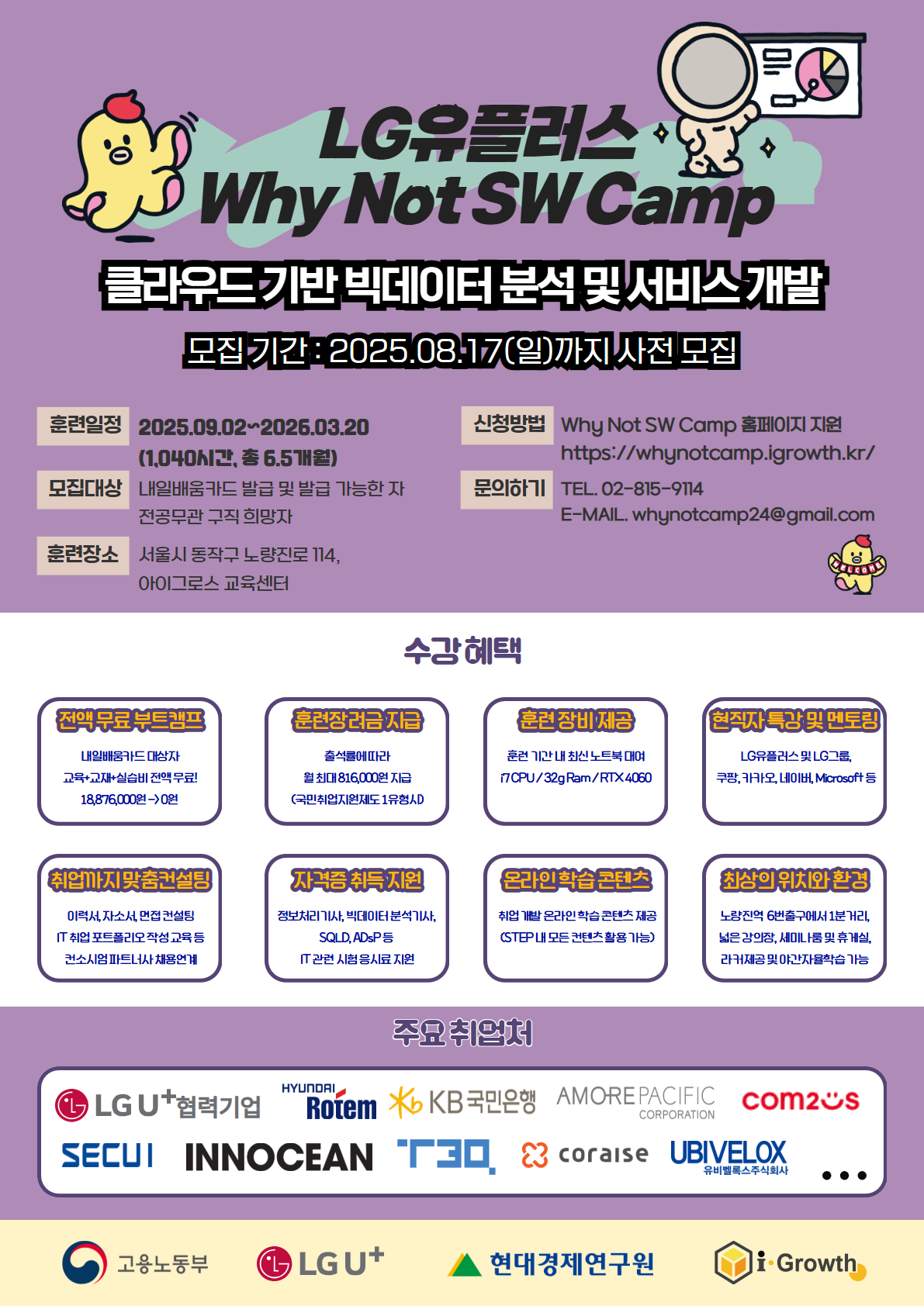 현재 LG유플러스에서는 클라우드 기반 빅데이터 분석 및 서비스 개발 전문가를 양성하는 특별한 기회를 제공합니다. 단순히 기술을 배우는 것을 넘어, 기업이 원하는 진짜 인재로 성장할 수 있는 LG U+ Why Not SW 캠프에서 여러분의 미래를 설계하세요!