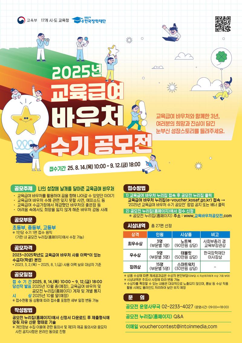 - 당선작 발표: 2025년 10월 중(예정), 교육급여 바우처 및 공모전 누리집(홈페이지) 게재 및 개별 통지
