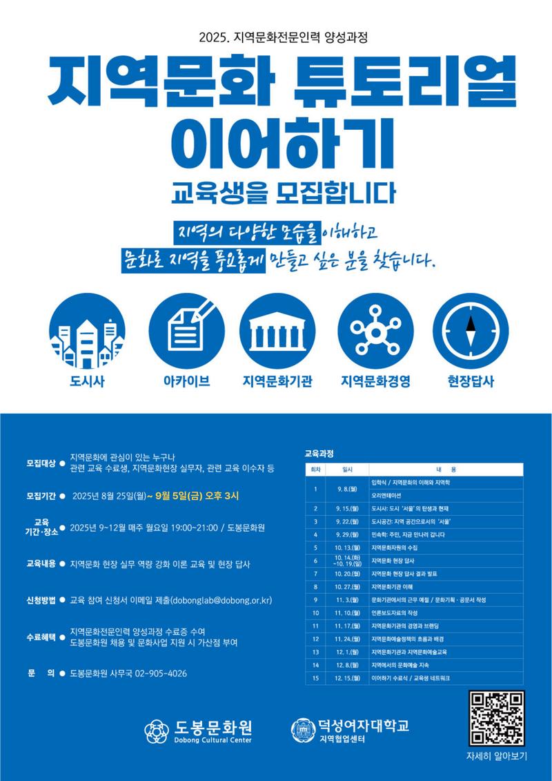 도봉문화원-덕성여자대학교는 문화체육관광부에서 지정한 '2023-2025. 서울·인천권 지역문화전문인력 양성기관'입니다.