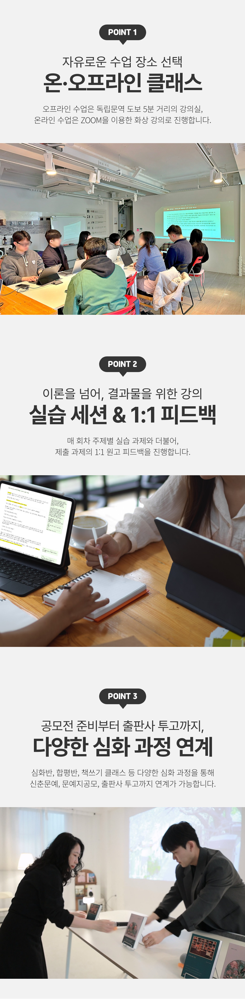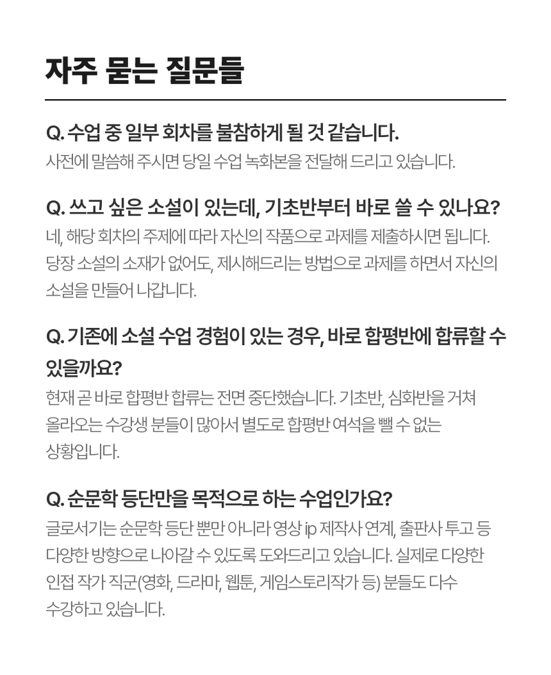 기초반 수료 이후에는 심화반, 합평반 과정으로 더욱 깊이있는 소설 창작으로 나아갈 수도 있습니다. 이미 이 과정을 통해 많은 수강생들이 등단에 성공했고, 매년 문예지 공모 준비도 이루어지고 있습니다.