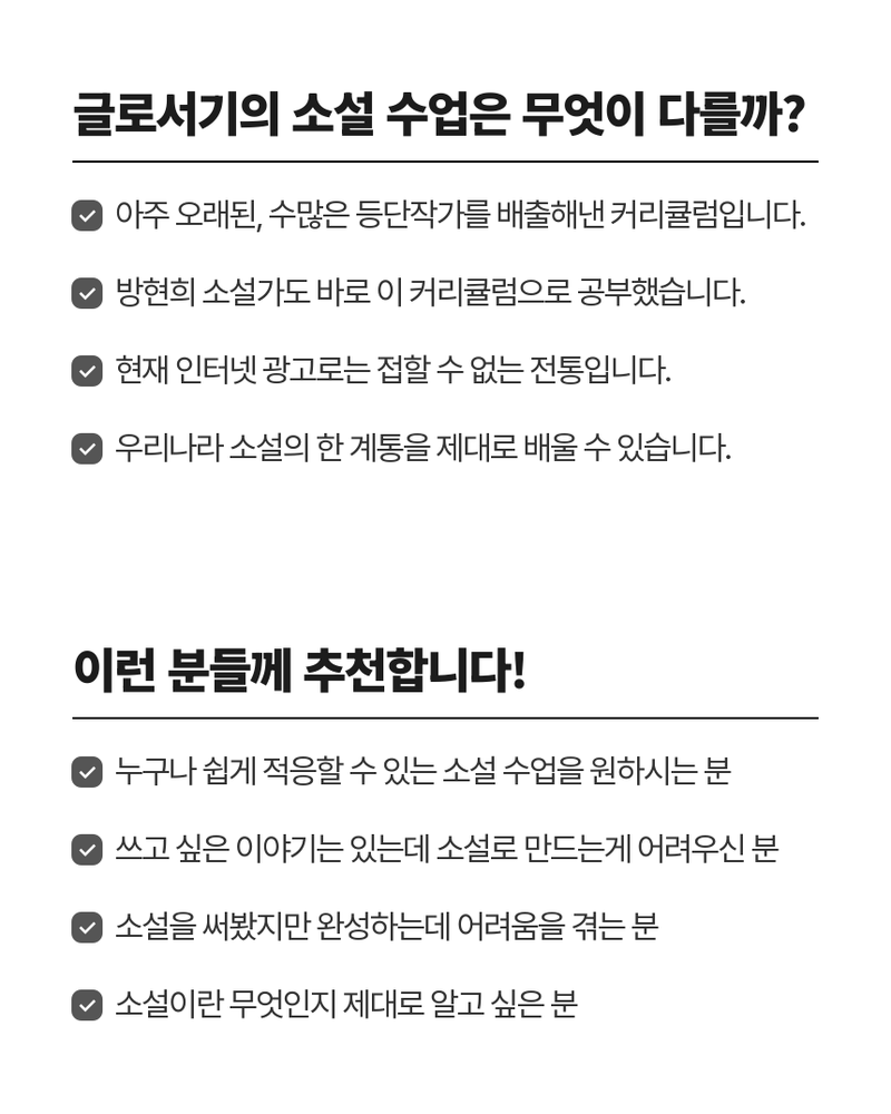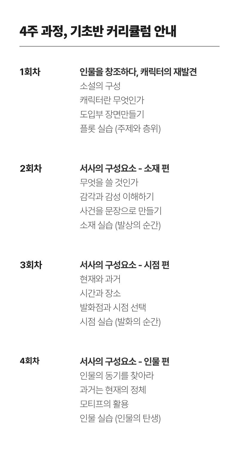 소설 작법 클래스(기초반 4주 과정) : 방현희 소설가에게 4주 동안 소설 창작의 기초 이론을 배우고, 매 회차 실습을 통해 단편 소설 한 편을 완성하는 것을 목표로 합니다. 본 소설 클래스는 2017년 첫 개강 이후로, 지금까지도 지속적인 커리큘럼의 업데이트가 이루어지고 있습니다. 특히, 전업 강사가 아닌, 매년 작품을 출간하는 현역 소설가에게 소설을 배울 수 있는 곳은 드뭅니다.