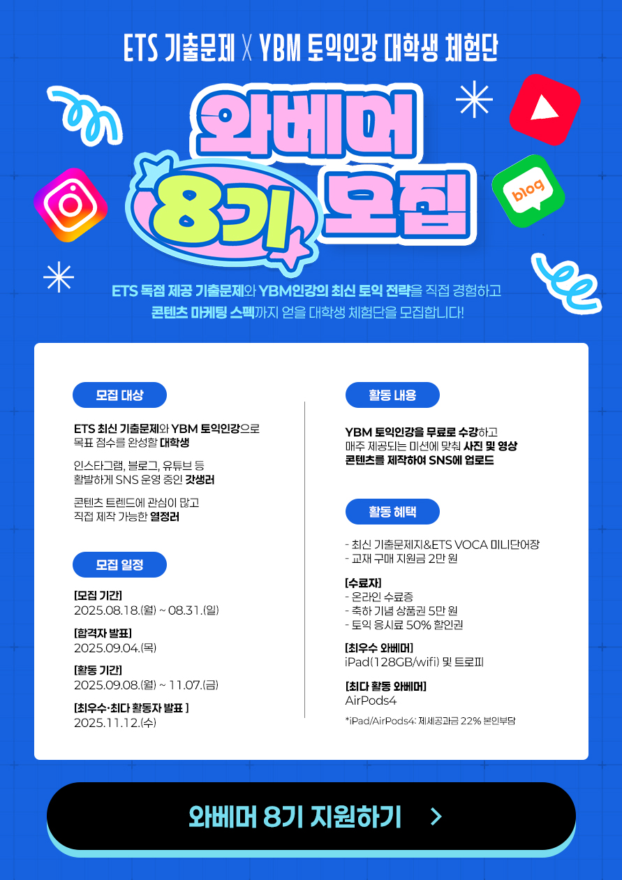 - YBM 토익인강 대학생 체험단 와베머 8기 모집 페이지 접수 (바로가기)
