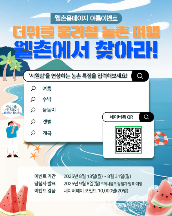 ※ 당첨 시 닉네임(아이디) 전체가 웰촌 SNS, 홈페이지 등의 이벤트 발표에 공개될 수 있음을 동의하신 것으로 간주됩니다.
