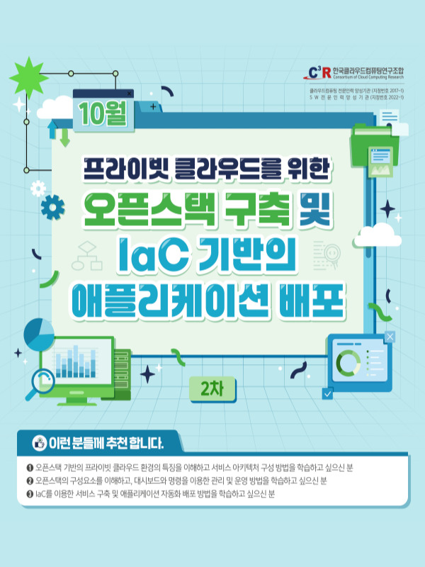 클라우드 산업에 필요한 중·고급 수준의 전문인력 양성을 통한 국내 클라우드 산업 경쟁력 강화를 위해 ICT 관련 업계 재직자 및 경력자 대상으로 실시하는 클라우드 기술 교육입니다.