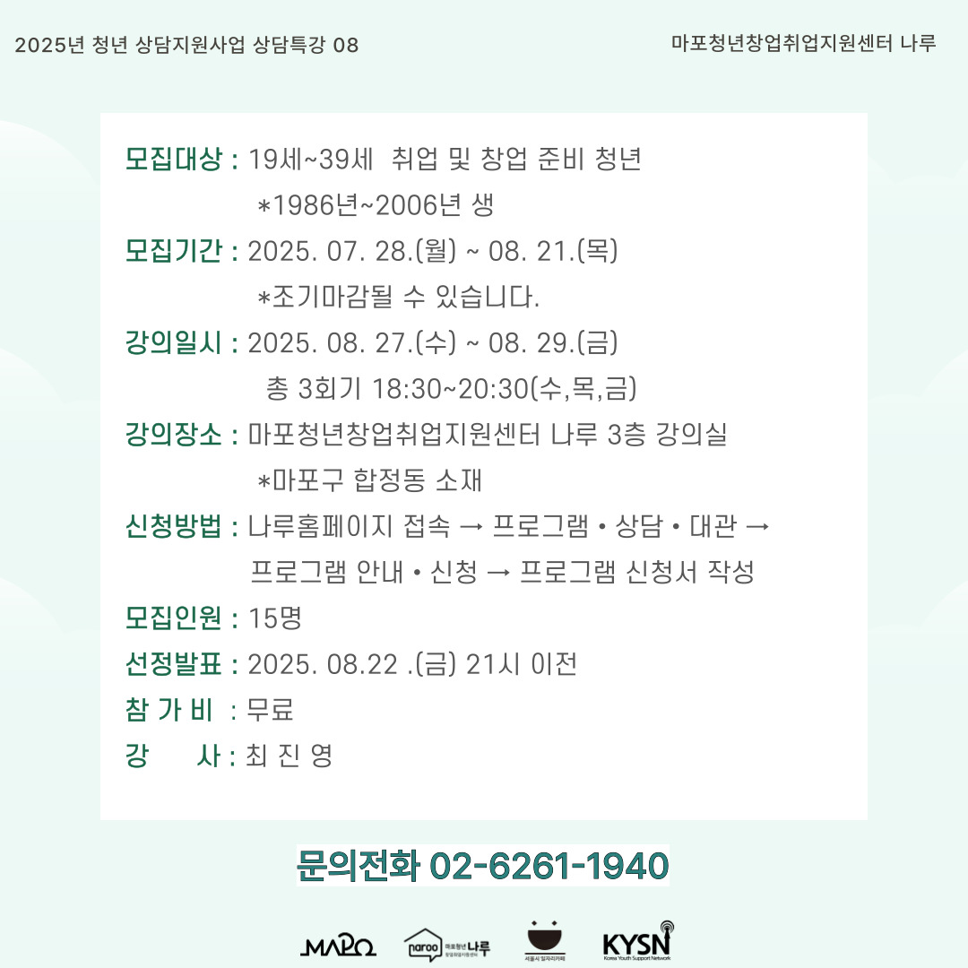 ✅ 대상: 19~39세 취업 및 창업 준비 청년 20명(*1986년~ 2006년생)