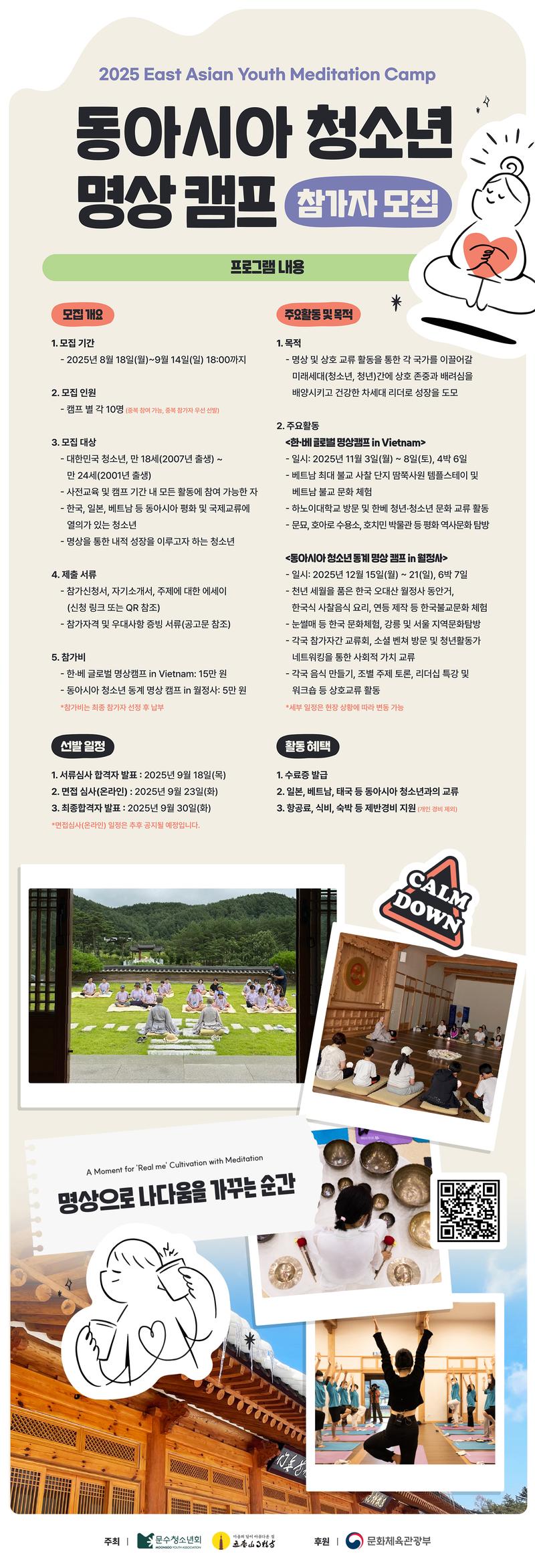 (사)문수청소년회는 청소년들의 건강한 인성과 조화로운 성장을 위해 2004년 4월 설립되어, 청소년 인성교육사업과 문화예술 탐방사업, 국제교류사업 등 다양한 사업을 통해 맑고 지혜로운 청소년 세상이 이루어지기를 위해 최선을 다하고 있습니다. <2025 한·베 글로벌 명상 캠프 및 동아시아 청소년 동계 명상 캠프>에 한국 대표단으로써 적극적으로 임할 대학생들의 많은 지원 바랍니다.