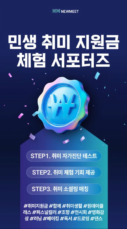 '뉴밋(New Meet)'은 삶의 방향을 찾고 싶은 20대 청년들을 위해 취미지원금 + 취미 매칭 + 체험 기회를 한 번에 지원합니다!