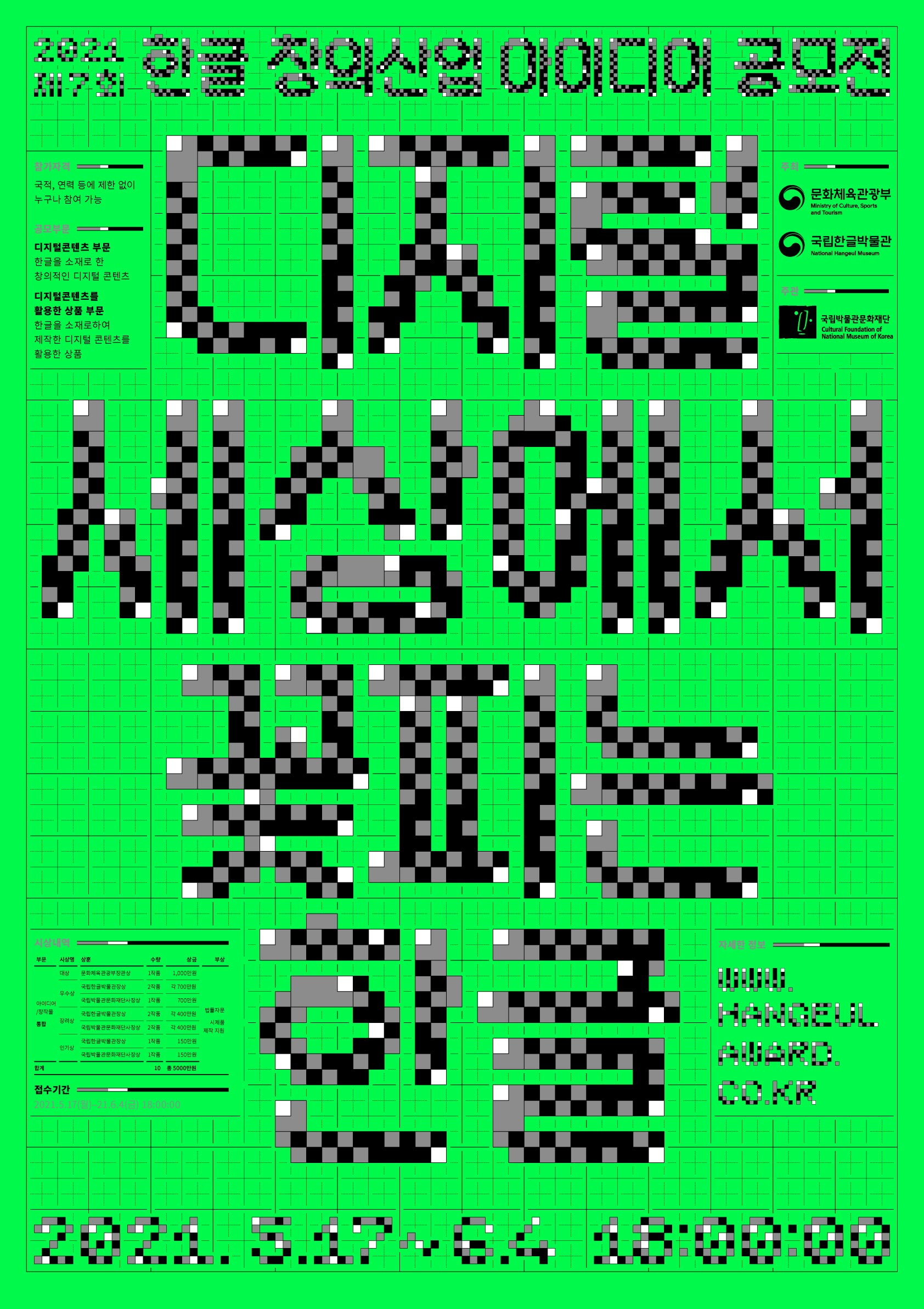 - 한글 파괴 등 한글 고유의 정체성이 훼손되지 않는 범위 내에서 응모 작품을 기획해 제시해야 함.
