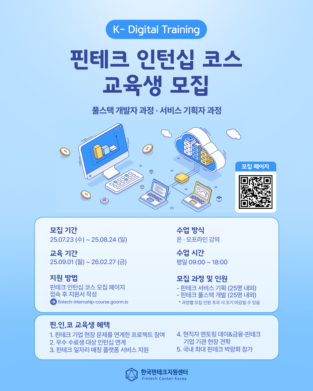 [한국핀테크지원센터x구름] 「K-디지털 트레이닝 핀테크 인턴십 코스」 3기 훈련생 모집 (~8/24까지)