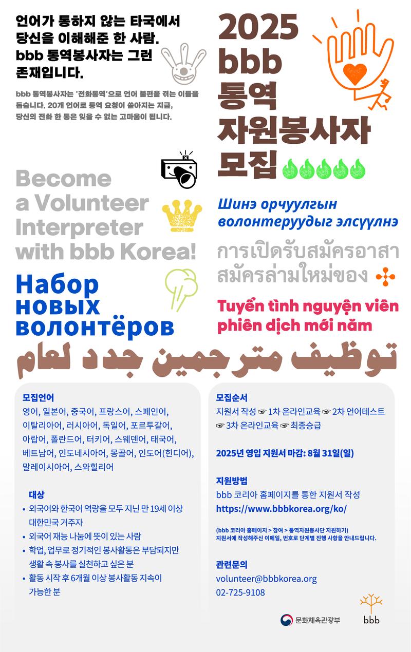 사람과 사람을 잇는 다리, bbb 통역의 2025년 신규 자원봉사자를 모집합니다.