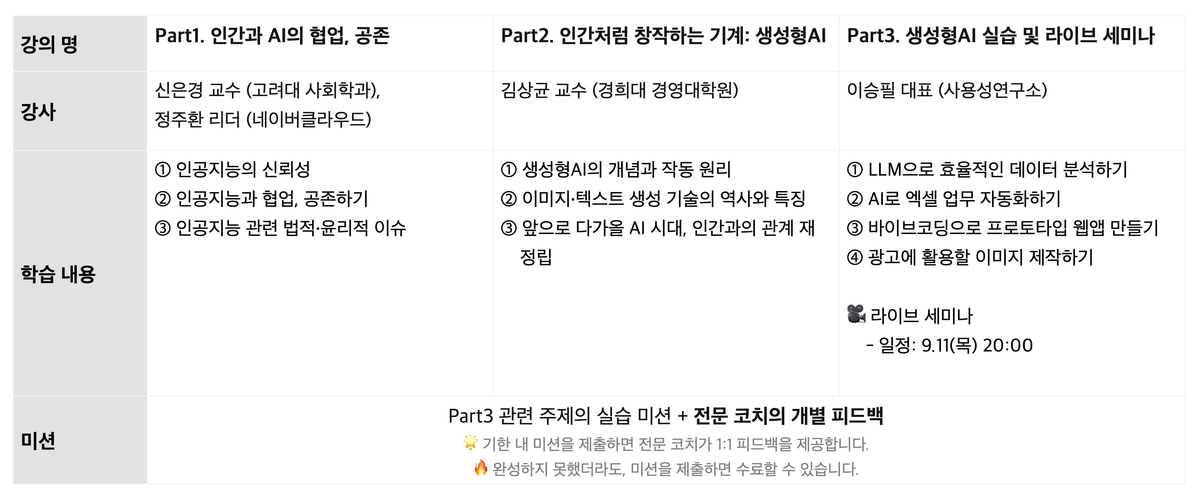 - 2주 강의 학습 및 미션 제출 + 1주 추가 학습 지원