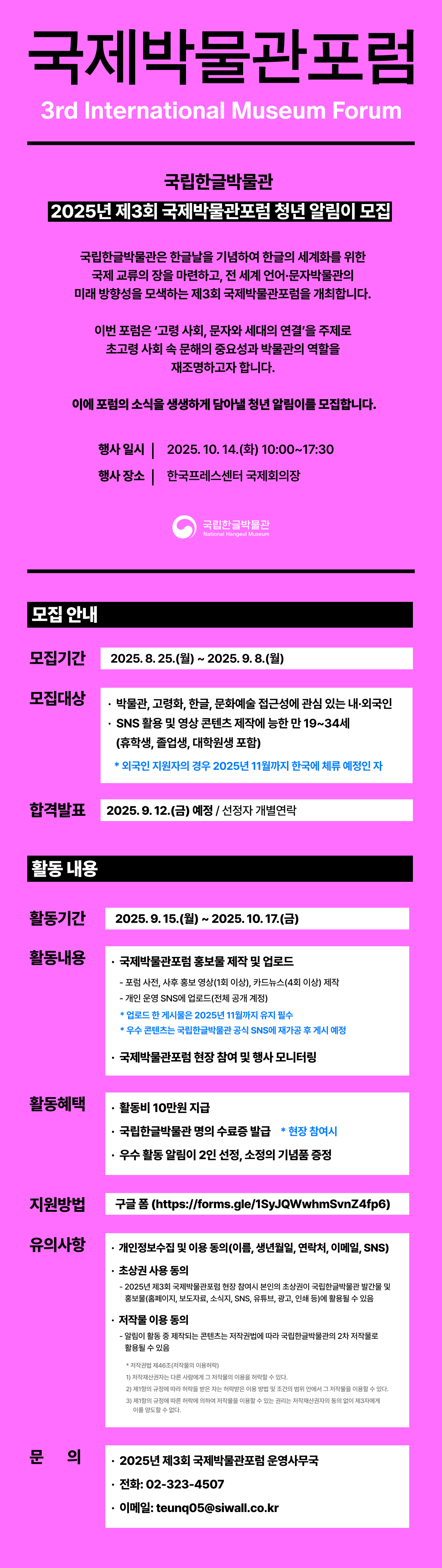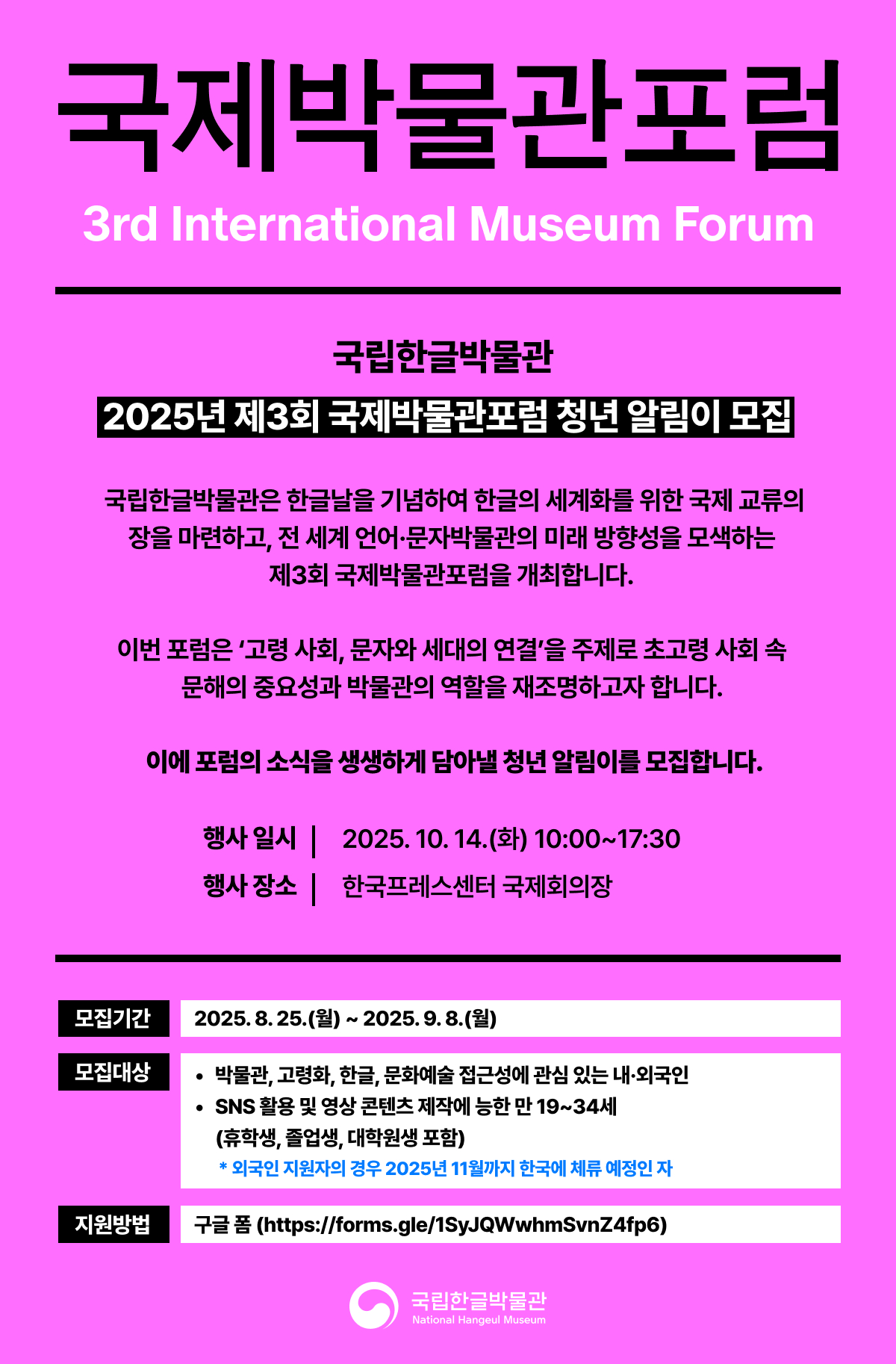 행사명: 국립한글박물관 2025년 제3회 국제박물관포럼 청년 알림이 모집