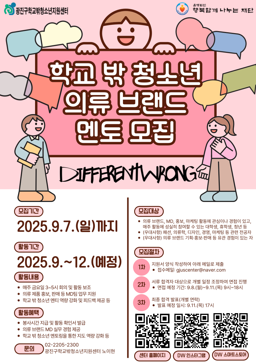 광진구학교밖청소년지원센터 창업 프로그램 디프런트롱에서는 학교 밖 청소년 멘티들과 함께 브랜드를 운영해주실 대학생 멘토를 모집합니다.
