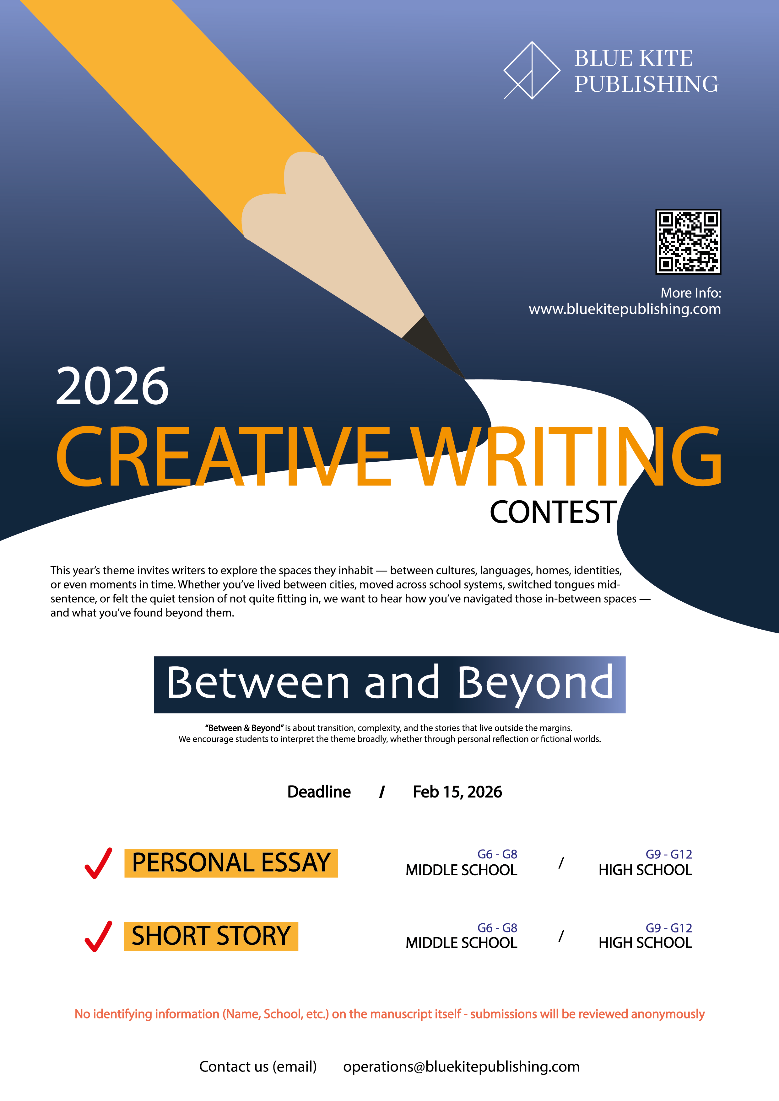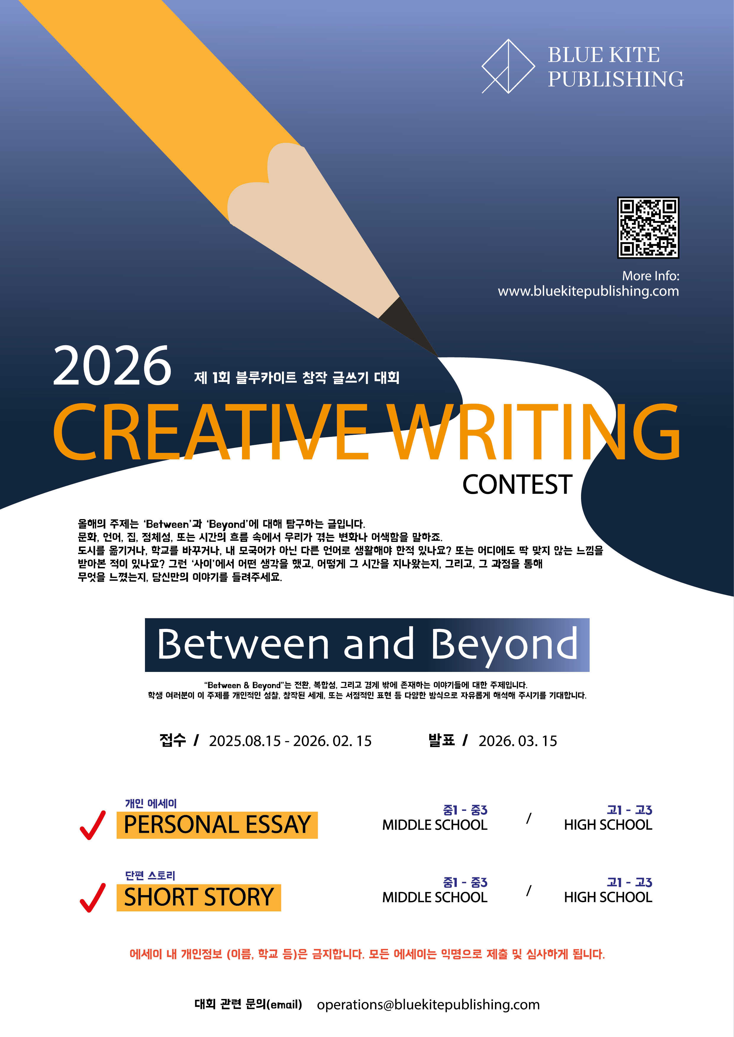 https://www.bluekitepublishing.com/ 홈페이지 접속 > Writing Contest > (홈페이지 하단) Click Here 클릭!