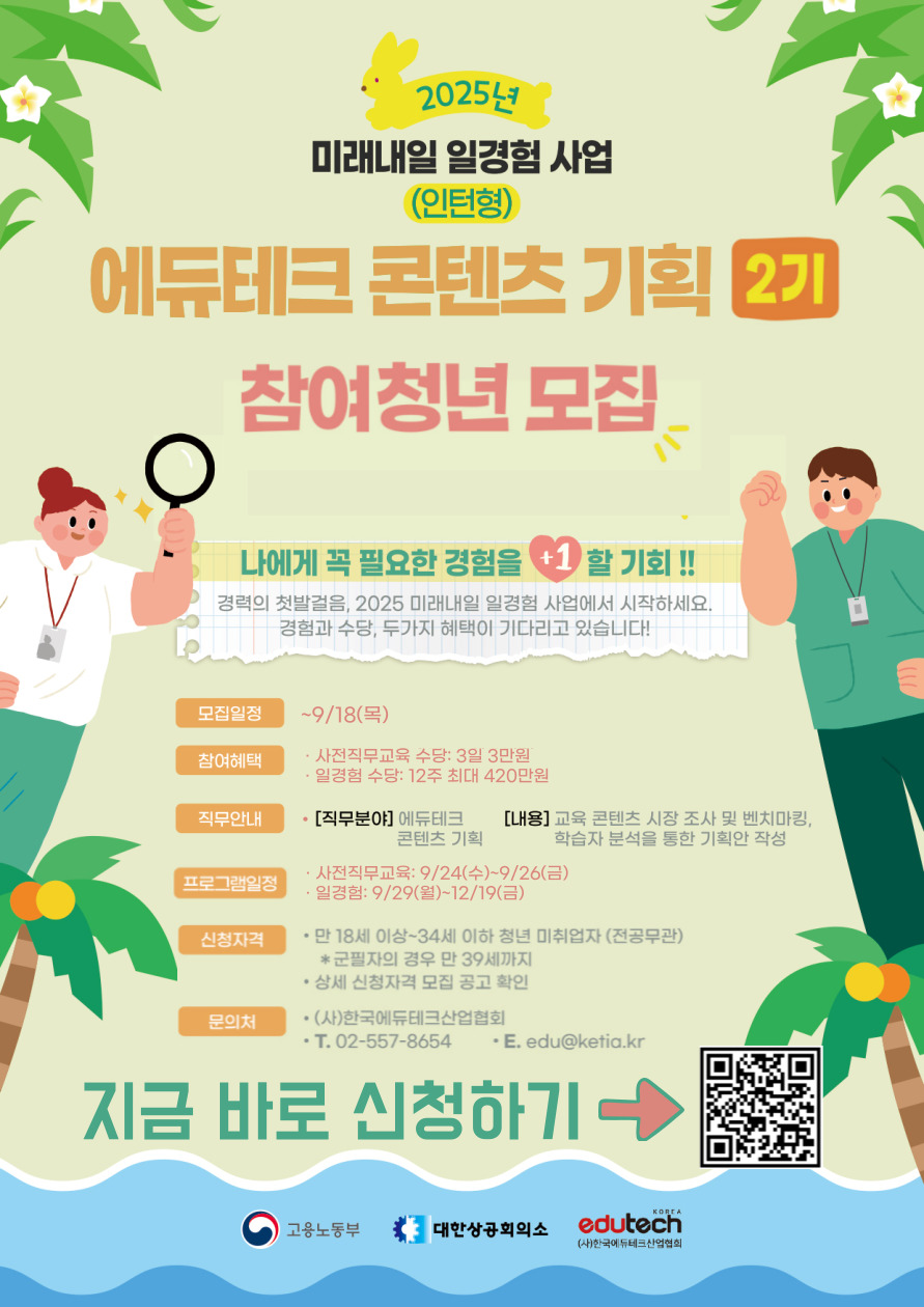 만 18-34세 청년들을 모집하여 에듀테크 콘텐츠 기획 2기 과정 일경험 프로그램을 진행하고 있습니다.