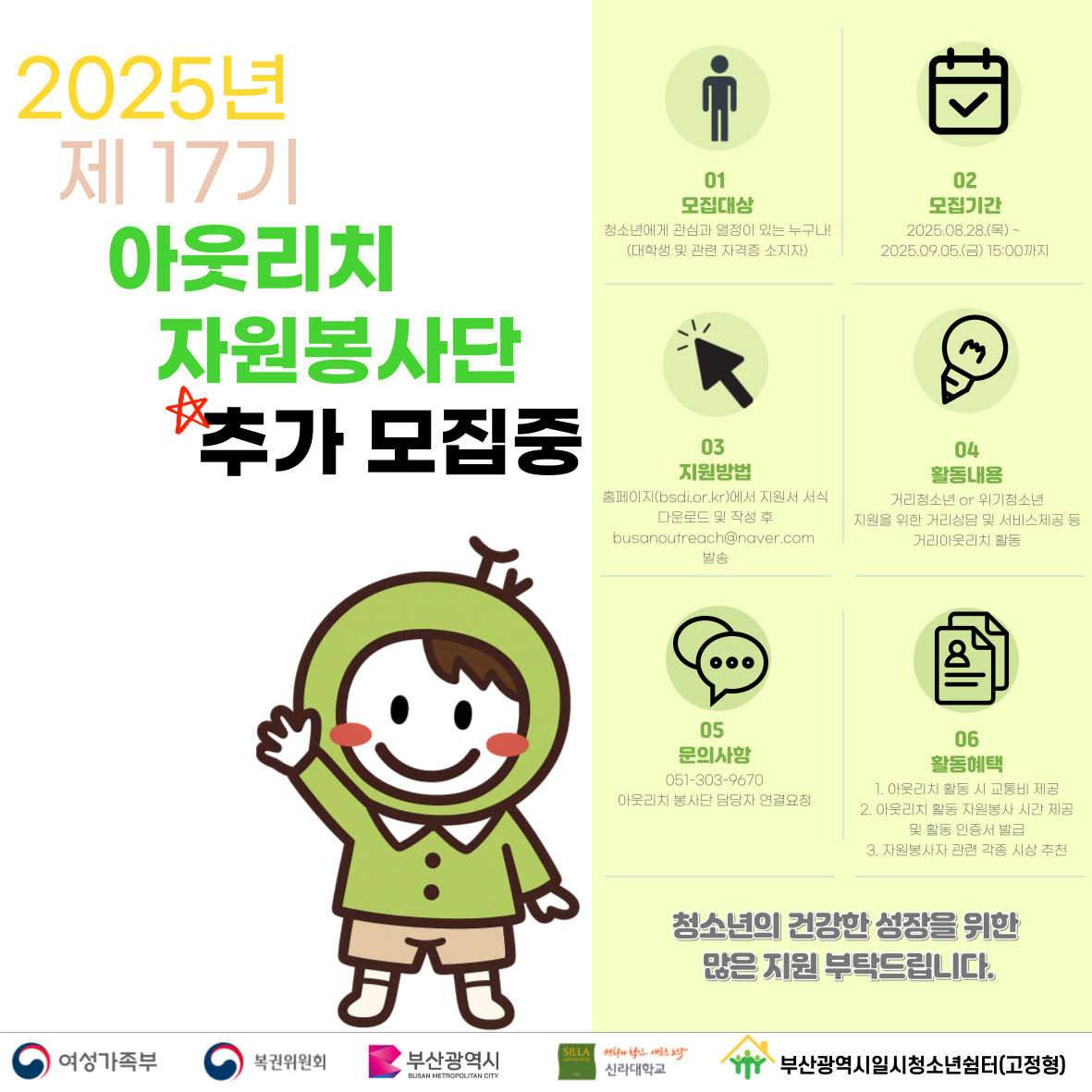 - 051-303-9670 자원봉사자 모집 담당자에게 연락주십시오.
