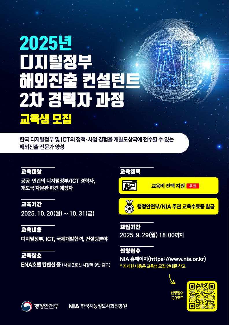 [한국지능정보사회진흥원] 2025년 디지털정부 해외진출 컨설턴트 경력자 과정 / 무료 교육생 모집 (~9/29)