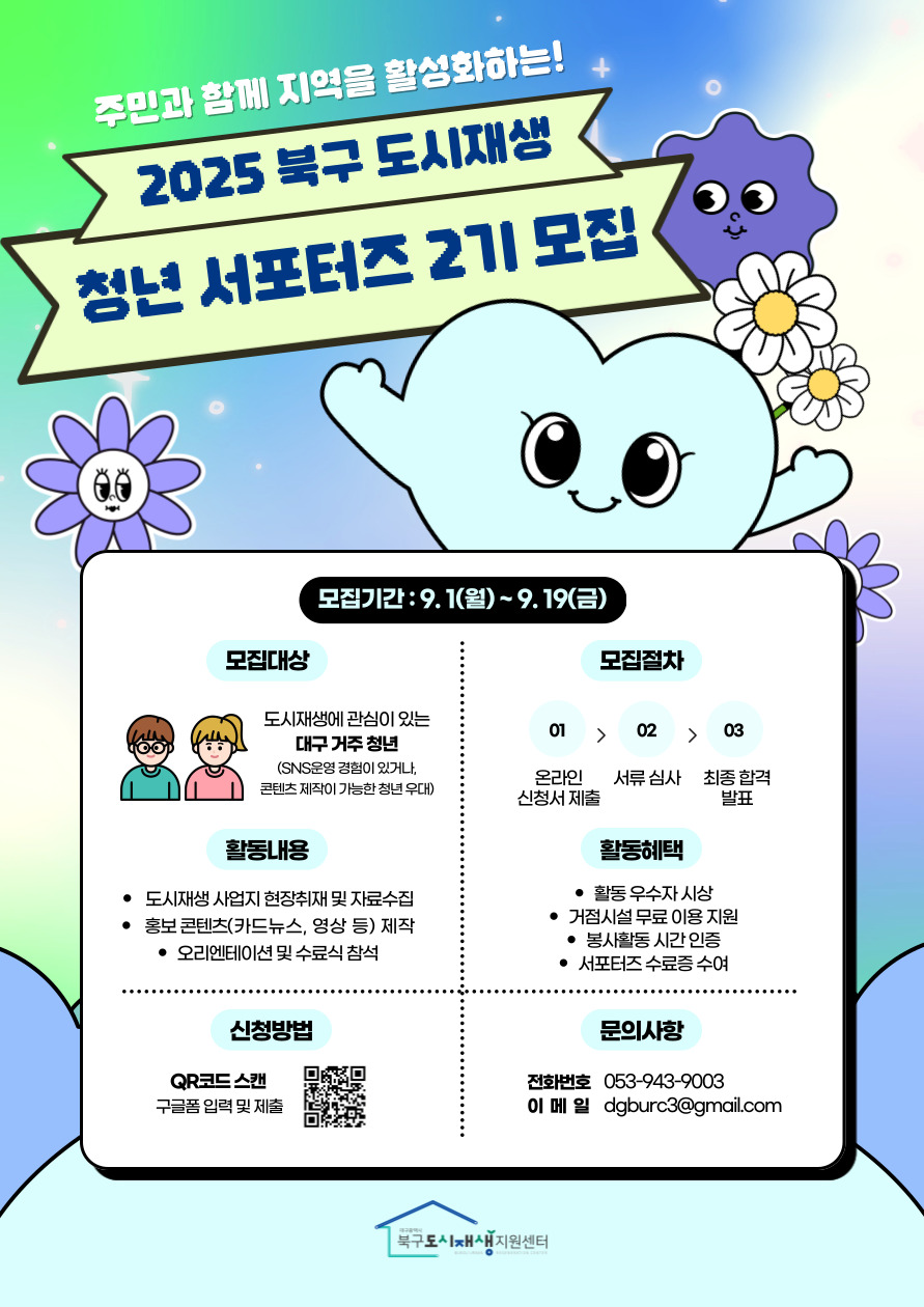 - 북구도시재생지지원센터 ☎ 053-943-9003 (담당자 : 팀장 정보경)