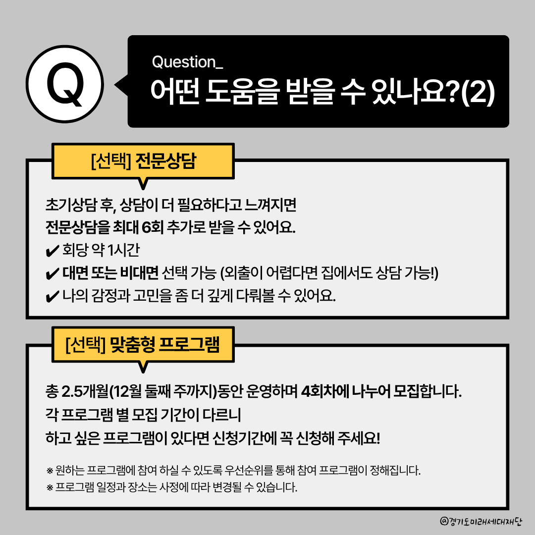 - 전문상담 및 맞춤형 프로그램 : 9.15.(월) ~ 12. 12.(금)