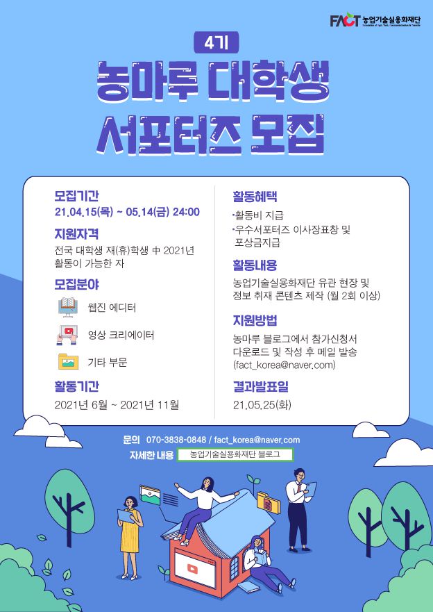 농업·농촌의 가치와 미래를 창출하는 농업기술실용화재단의 제4기 서포터즈를 모집합니다.