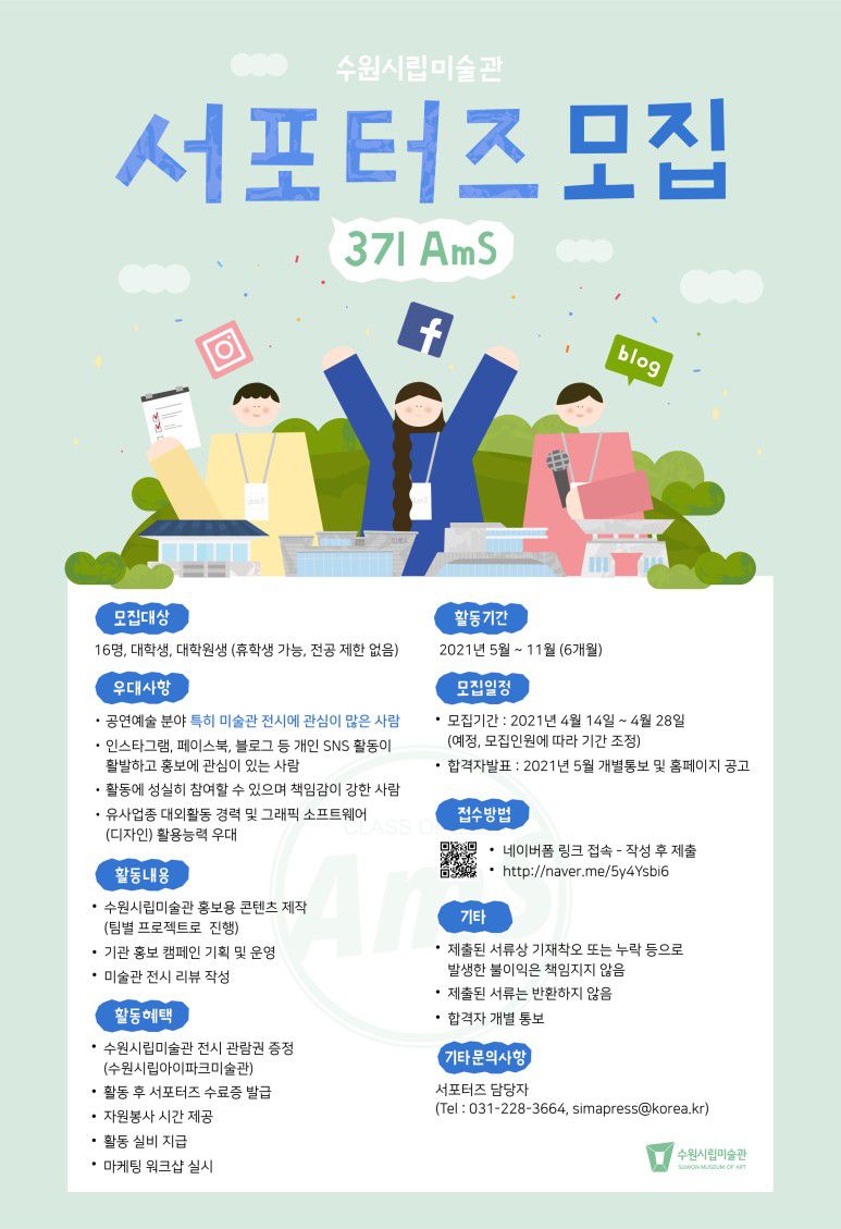 수원시립미술관 전시 및 기관 홍보와 시민 문화 향유 기회를 확대할 서포터즈 3기 AmS를 모집합니다.