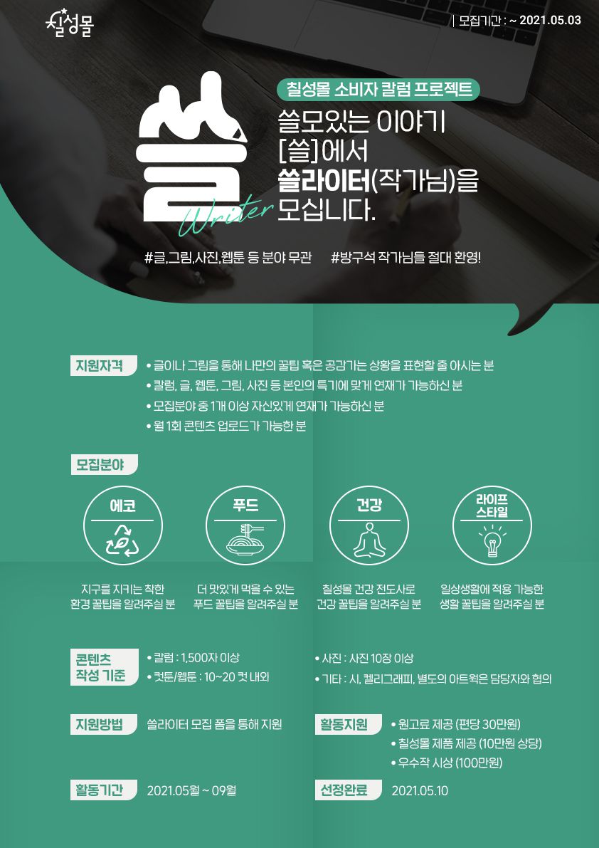 칠성몰 소비자 칼럼 프로젝트 '쓸'에서 재능있는 쓸라이터 작가님을 모십니다.