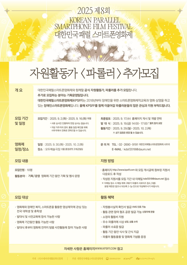 전화: 02-2690-9191 (대한민국패럴스마트폰영화제 사무국)
