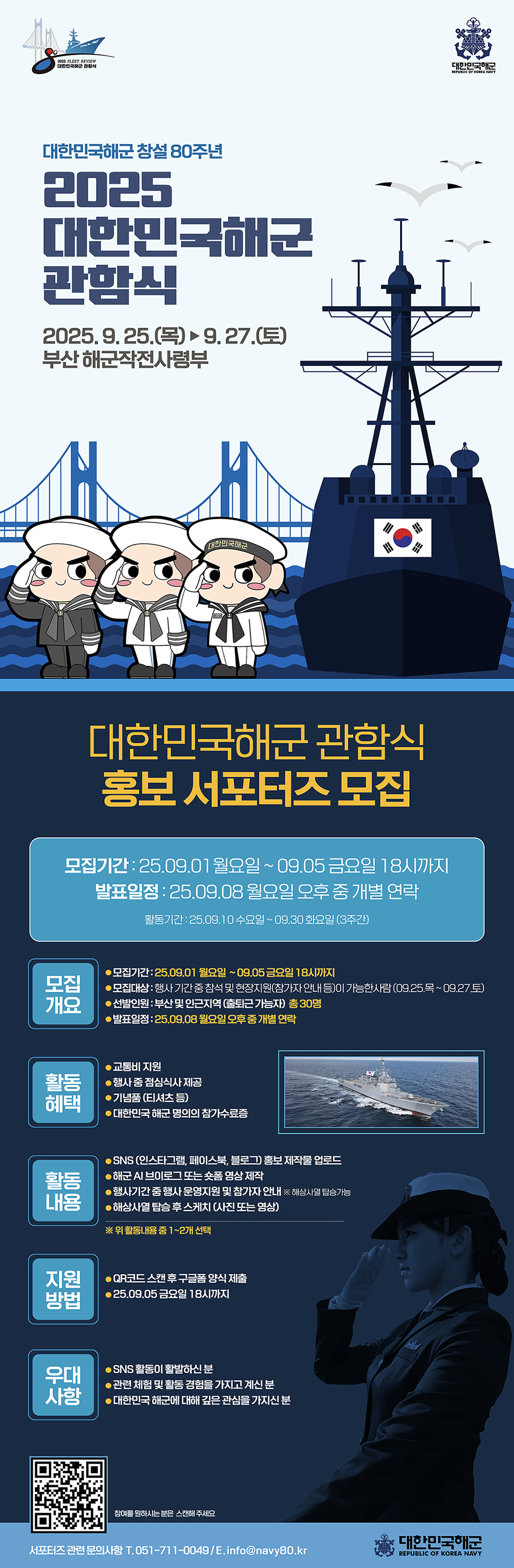 2025 대한민국해군 관함식은 해군창설 80주년을 기념하고 압도적인 대비태세 구축을 바라는 국민의 기대에 부응하며, 국민과 함께하는 해군상 구현을 위하여 본 행사를 개최하게 되었습니다. 이에 본 관함식의 성공적인 개최를 위해 홍보 서포터즈를 모집하고자 합니다.