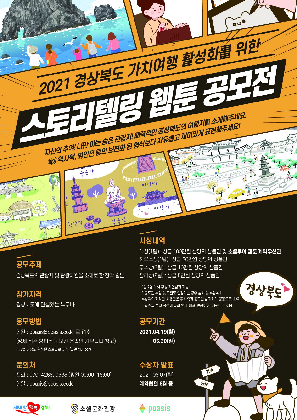 - 경북도청에서 주최하는 「2021 경북형 가치여행 활성화를 위한 스토리텔링 웹툰 공모전」 을 다음과 같이 공모합니다.