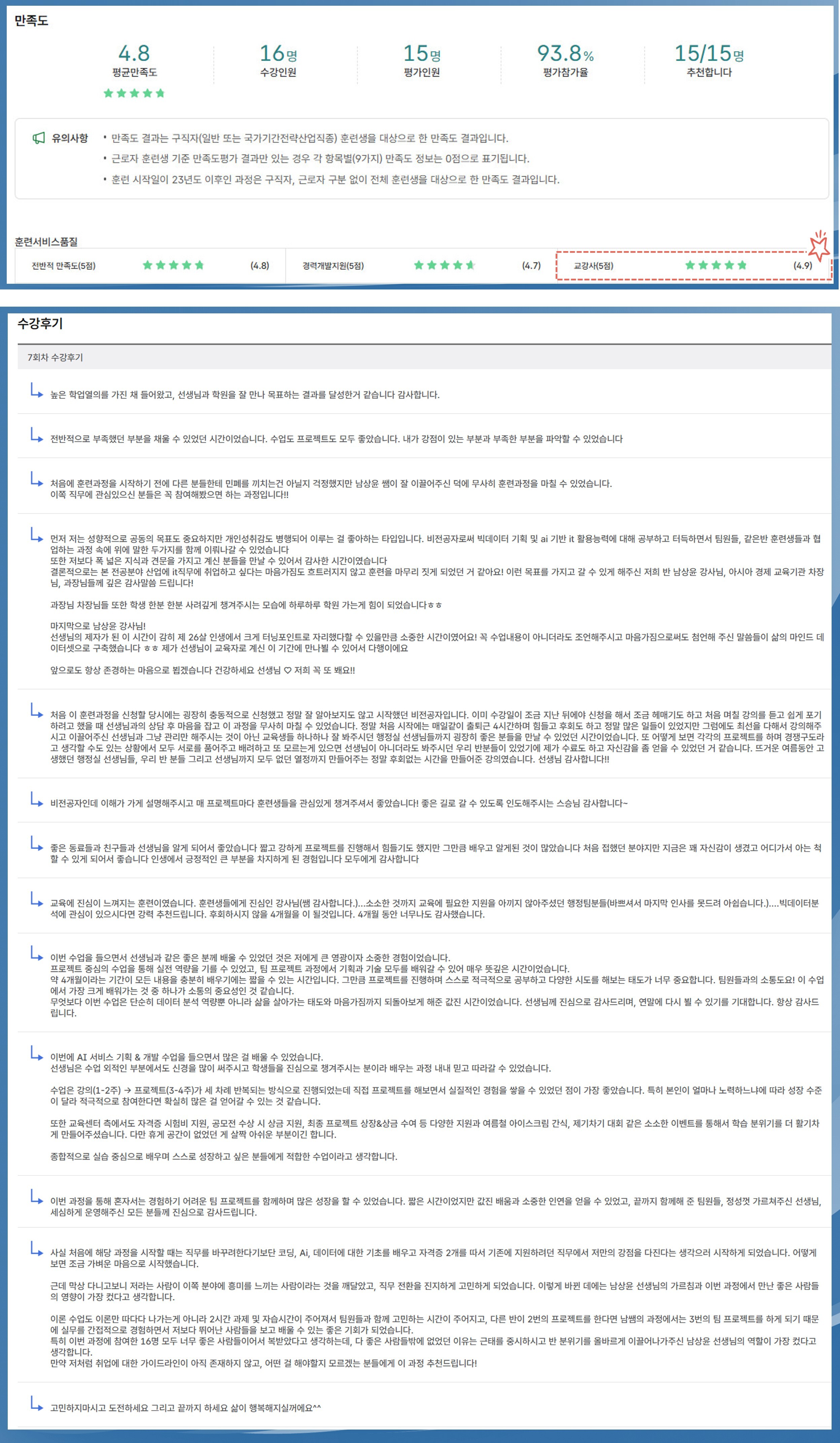 🎓 교강사 평균 만족도(4.9) + 후기 + 수료율 + 취업률 모두 만족시킨 강사& 멘토 지도