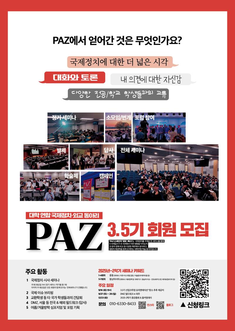 <๋ํ ์ฐํฉ ๊ตญ์ ์ ์นยท์ธ๊ต๋์๋ฆฌ : PAZ>์์ ํจ๊ป ํ 3.5๊ธฐ ํฌ๋ฃจ์์ ๋ชจ์งํฉ๋๋ค. โPAZโ๋ ๊ตญ์ ์ ์น ์ด์ ์ธ๋ฏธ๋๋ฅผ ํตํด ๊ตญ์ ์ง์๊ฐ ์ ์ธ๊ณ์์ ์ด๋ค ์ํฅ์ ๋ฏธ์น๋์ง ์ ์น๏น๊ฒฝ์ ๏น์ธ๊ต ๋ฑ ๋ค์ํ ์ธก๋ฉด์์ ๋ถ์ํ๊ณ , ํํ์ ํด๊ฒฐ์ฑ ์ ํจ๊ป ๋ชจ์ํ๋ ๋ํ ์ฐํฉ ํ์ ๋์๋ฆฌ์ ๋๋ค. ๊ตญ์ ๋ด์ค๋ถํฐ ์ ๊ณต์์ , ๋์ธํ๋์๋ ๋์์ด ๋๋ ์ฌ๋์๋ ๋ด์ฉ๊น์ง ๊ฐ์ถ PAZ์ ๋ง์ ๋ถ๋ค์ ์ง์์ ๋ฐ๋๋๋ค!