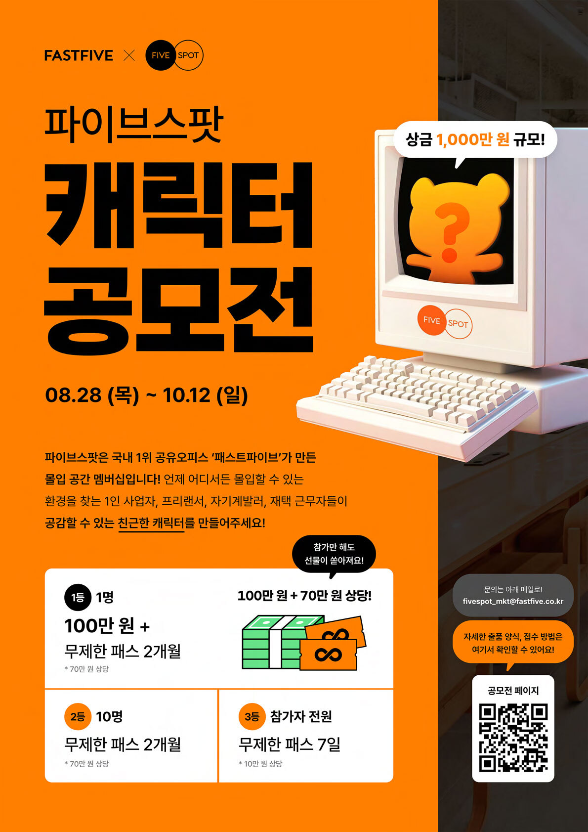 국내 1위 공유오피스 패스트파이브가 만든 몰입 공간 멤버십, 파이브스팟의 첫 캐릭터 공모전에 도전해 보세요!완성된 캐릭터는 파이브스팟의 콘텐츠, 굿즈, 그리고 공간 곳곳에서 함께하게 됩니다.