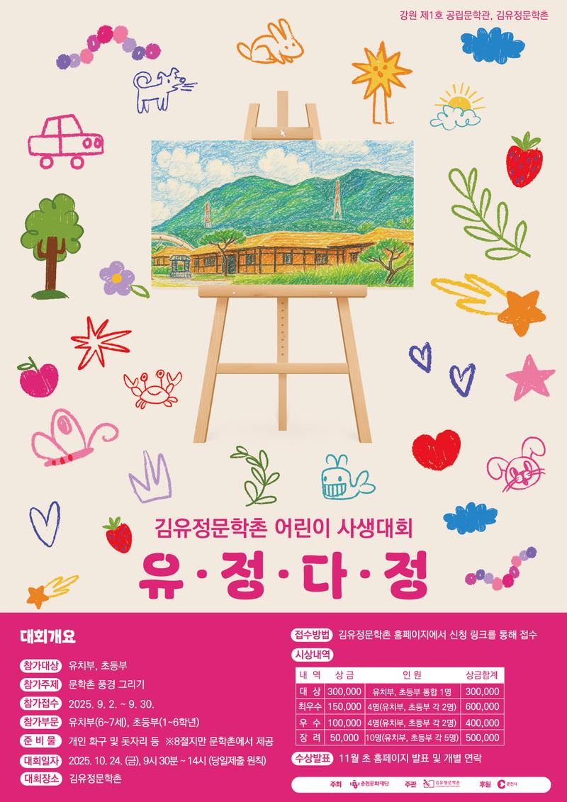 김유정문학촌에서는 금병산 자락에 위치한 문학촌의 아름다운 풍경을 주제로 어린이 사생대회를 개최합니다.어린이들이 자연 속에서 상상력을 펼치고 창의적인 작품을 남길 수 있는 소중한 기회가 될 이번 대회에 많은 참여 바랍니다.